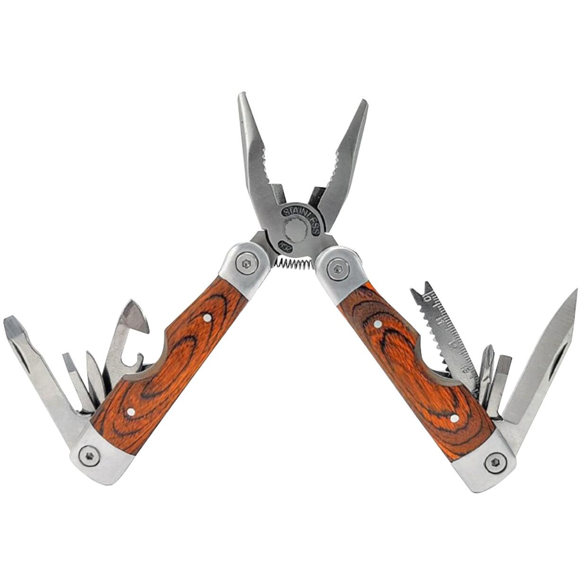 Zange, Messer, verschiedene Schraubendreher, Säge, Feile und Flaschenöffner