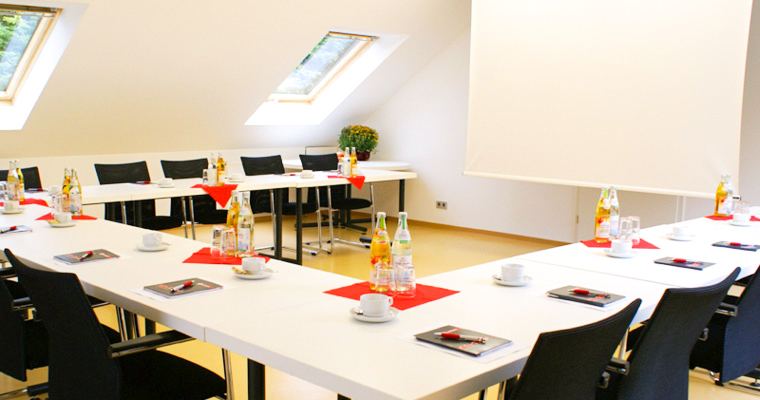 Im Obergeschoss befindet sich der 25 m² große Raum „Waldblick“, der sich gemütlich unter Dachschrägen einfügt. Die vielen Dachfenster sorgen für viel natürliches Licht und im Sommer für genügen Durchzug.