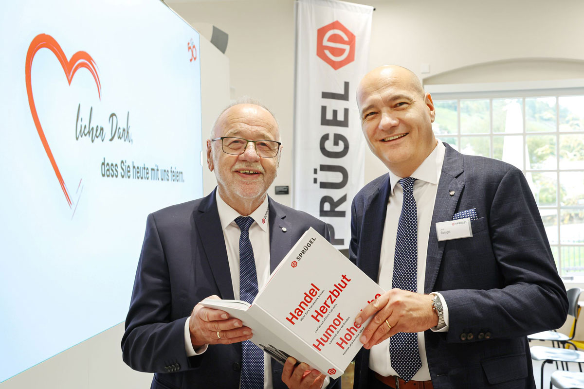 Gerhard Sprügel (links) und Jens Sprügel blicken gemeinsam auf 50 Jahre Unternehmensgeschichte zurück - und freuen sich über die umfassende Firmenchronik. Bild: Ufuk Arslan