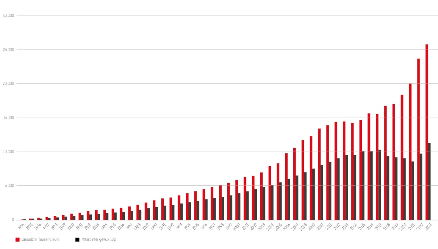 So sehen bei SPRÜGEL die Entwicklungen beim Umsatz und den Mitarbeiterzahlen in den letzten 50 Jahren aus.